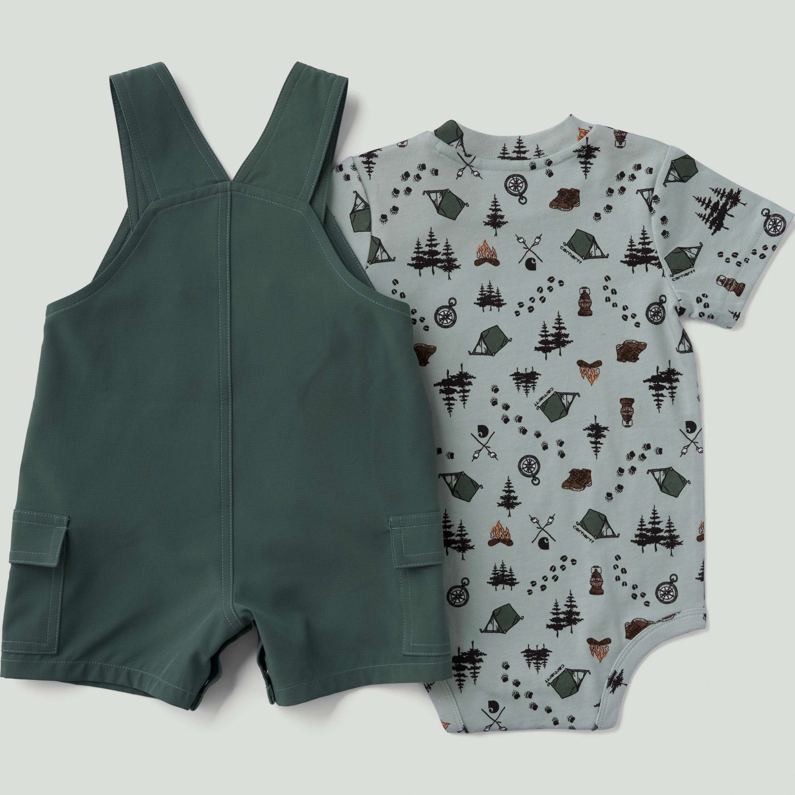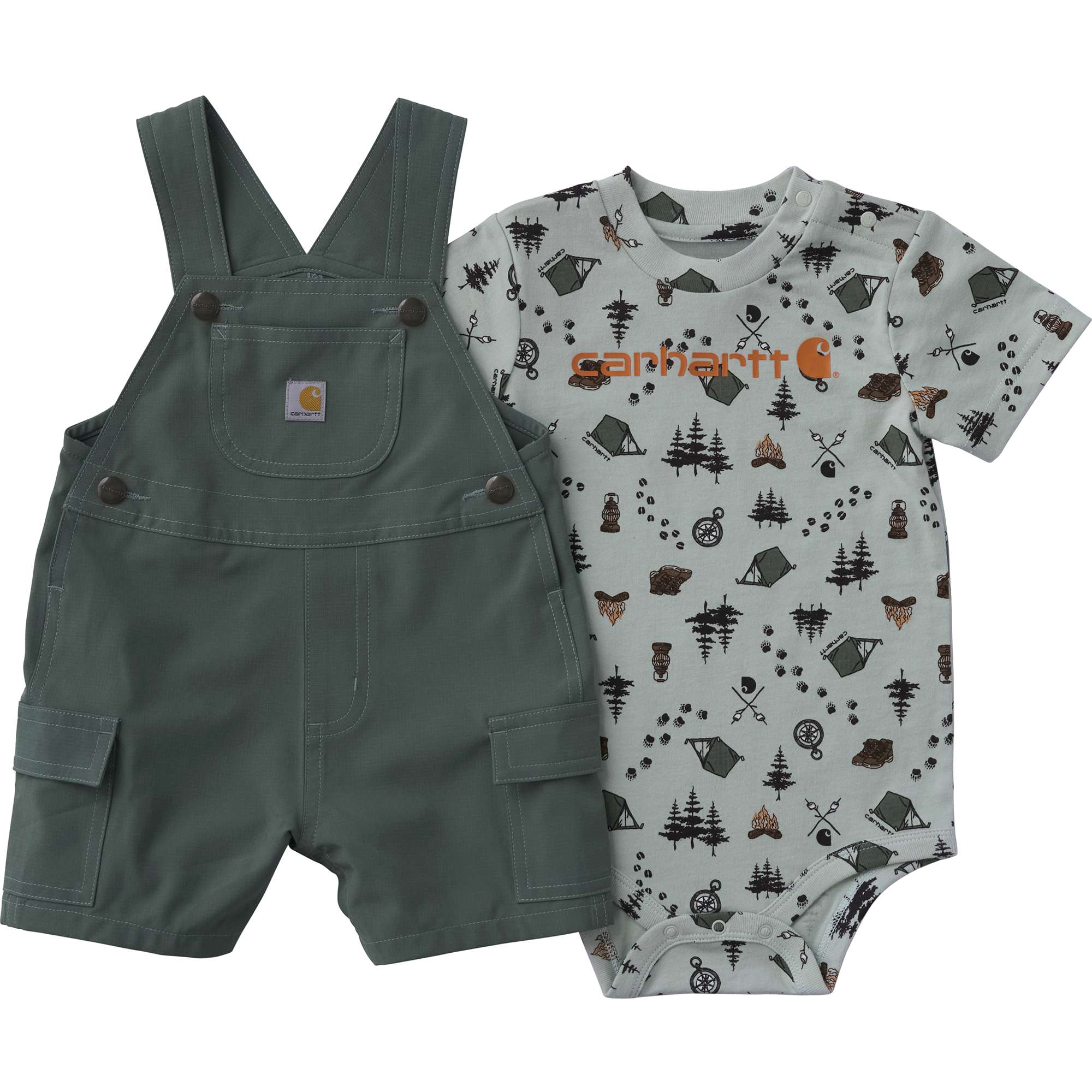 Because life’s better beyond four walls, this baby boys’ Carhartt two-piece set features fun camping graphics. The soft yet durable bodysuit has crotch snaps for easy outfit changes, and the shortalls are made to outlast big adventures.
