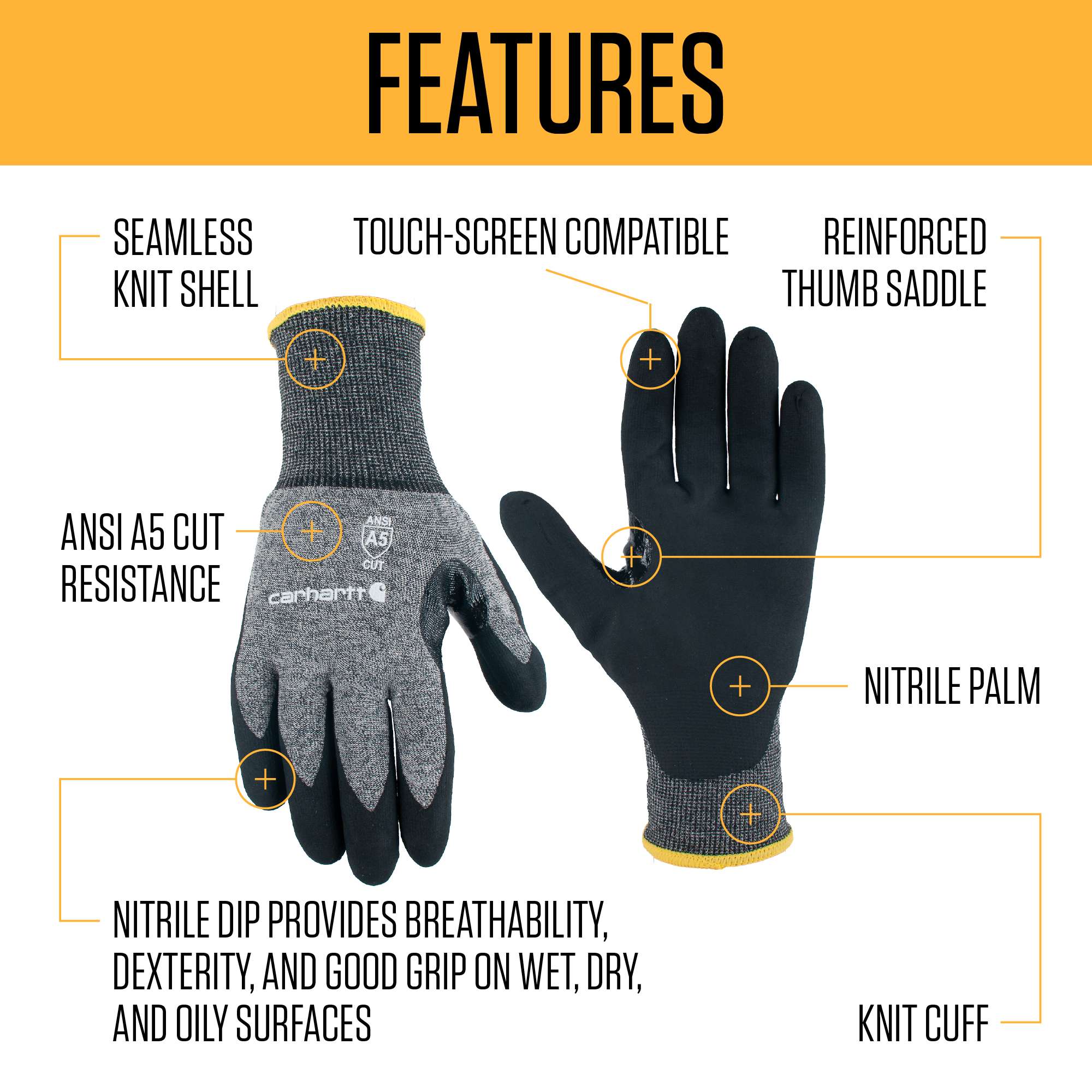 From manufacturing to mechanics, nitrile work gloves deliver a secure grip on tools and machinery with the natural dexterity you need to work efficiently. Our men’s Cut-Resistant Nitrile Work Gloves feature touch-sensitive fingertips that allow for phone and tablet use, plus a seamless knit fabric that resists cuts.
