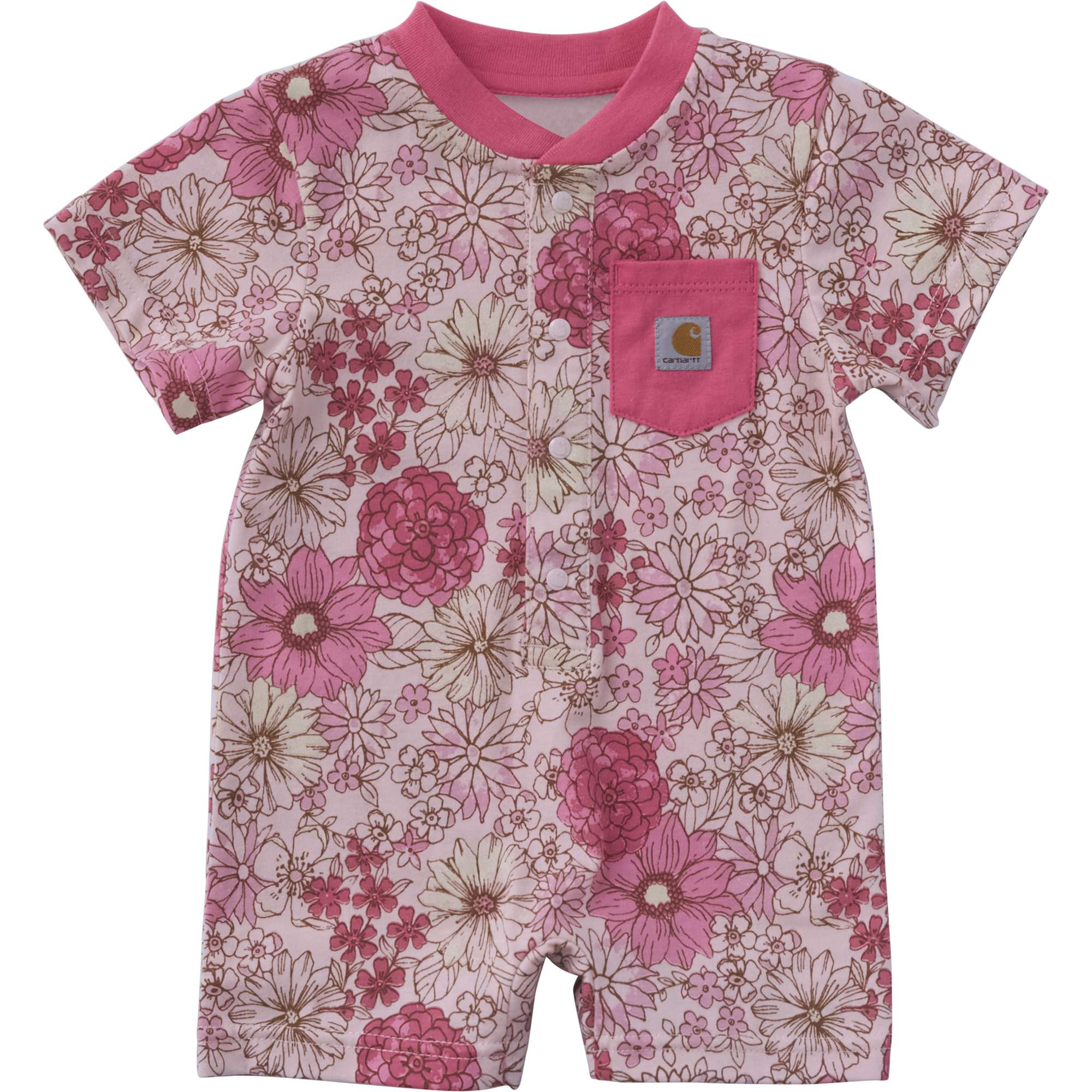 Flower power forever. A fresh floral print covers this baby girls’ Carhartt romper. It’s built to last from lightweight cotton fabric that’s gentle on her skin, with a chest pocket and front snaps.
