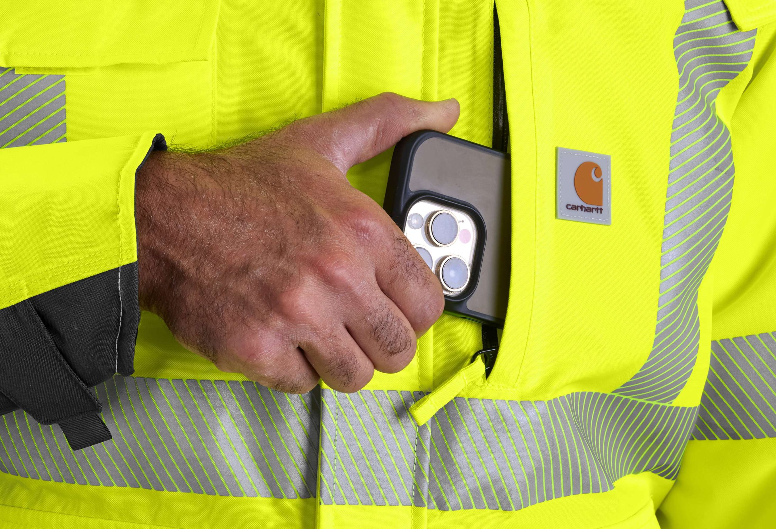 This men’s high-visibility jacket keeps you seen on the job while staying comfortable through the cold. It shrugs off light to moderate rain with a waterproof shell, and it has a soft brushed lining for warmth. This rugged layer features shoulder straps for your radio as well as a mix of zip pockets and flap pockets. The reflective silver trim is segmented for breathability.