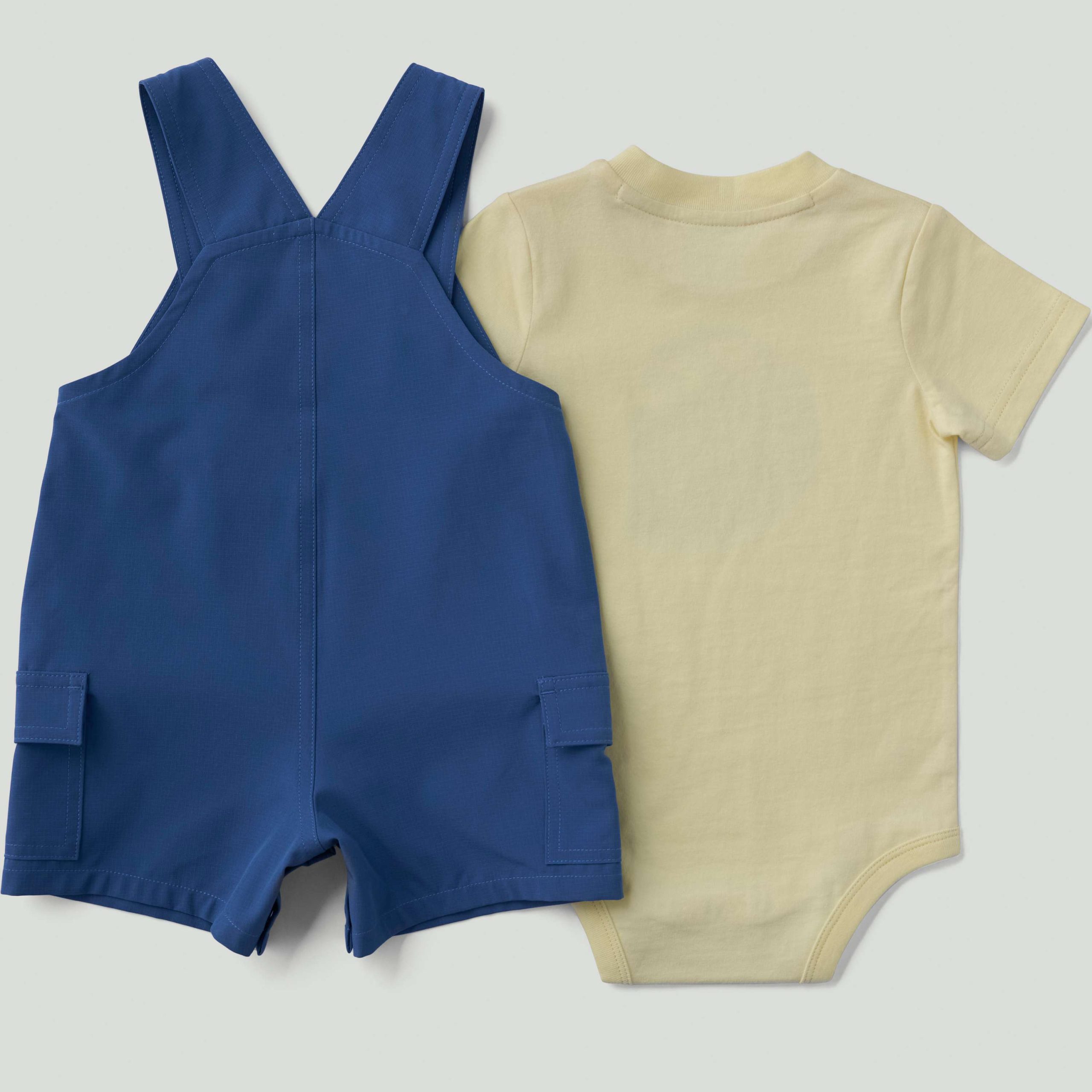 - Set includes short-sleeve bodysuit and adjustable-strap shortalls