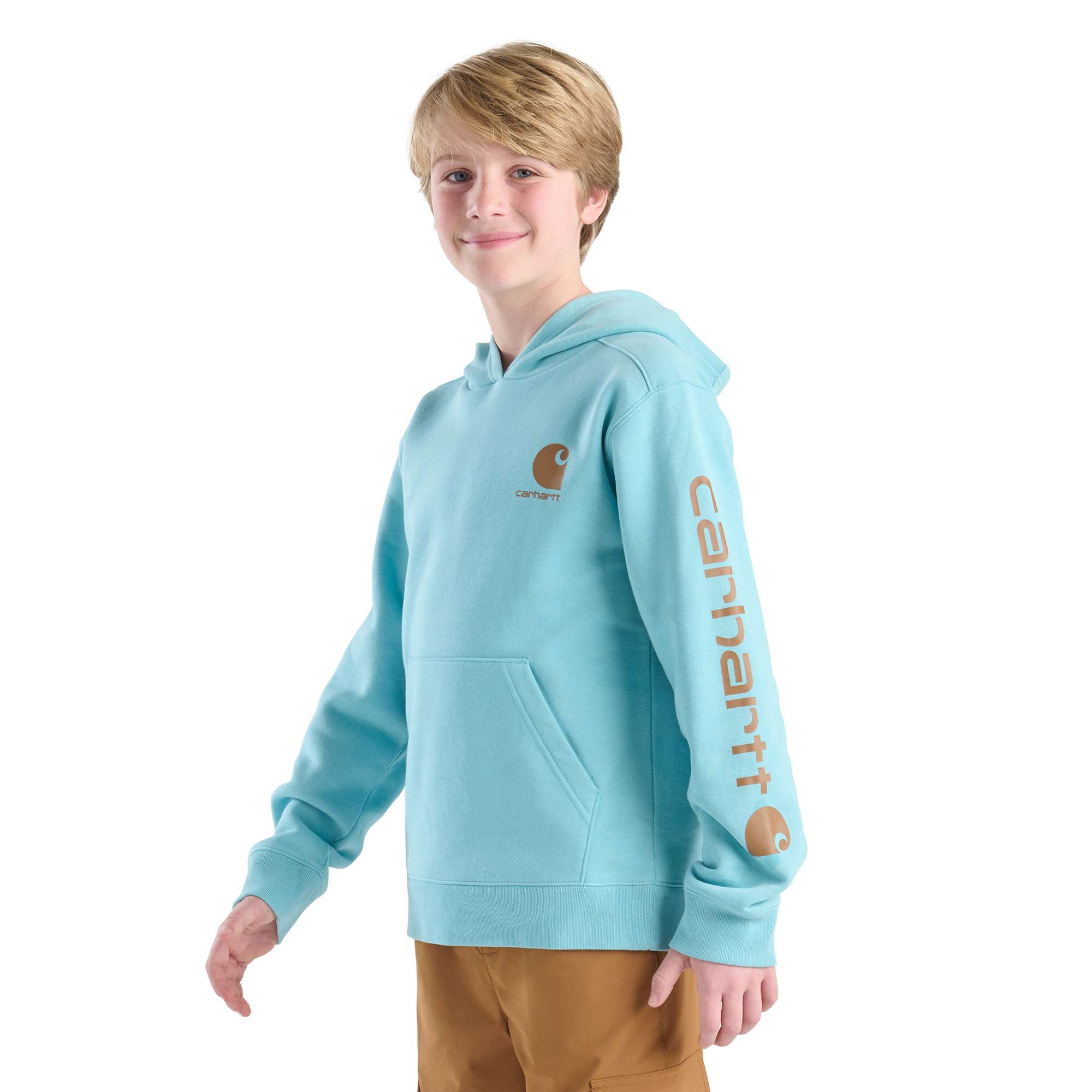 Boys of all ages will dig this long-sleeve sweatshirt’s cozy warmth and workman style. Made from fleece with all the durability and dependability you expect from Carhartt, this pullover has a full hood for extra coverage and a big front pocket for stuff.
